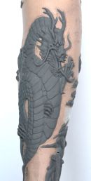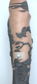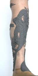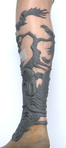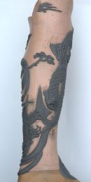 When the sculpt was complete, which I have always thought of as a 3D Tattoo, I moulded and cast all of the pieces with a curved back to fit the position on the leg & then finished them to look like ivory.